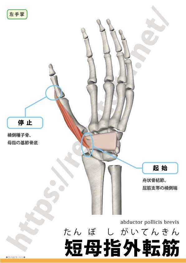 | 停止 | 橈側種子骨・母指基節骨底(橈側)(一部は伸筋腱膜へ移行) |