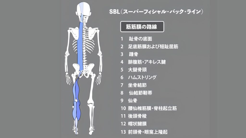 **SBL(Superficial Back Line)**と連関:足底腱膜~下腿後面~ハムストリング~脊柱起立筋へ。