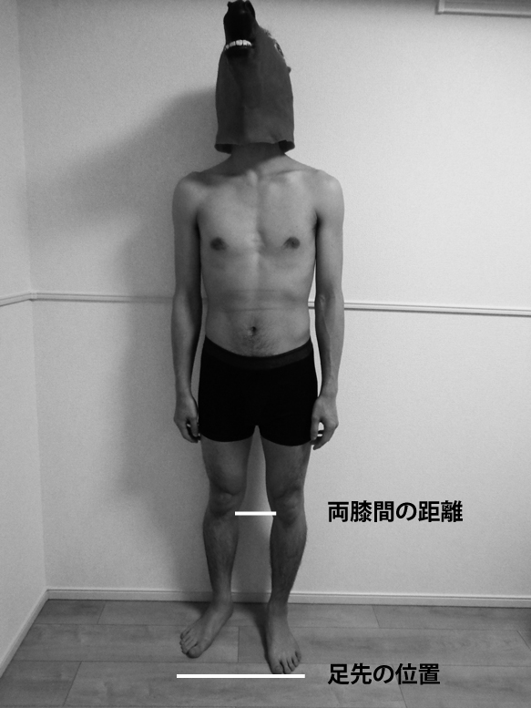 膝:内反/外反(両膝間距離)、膝蓋骨の向き(股関節回旋の代償を反映)