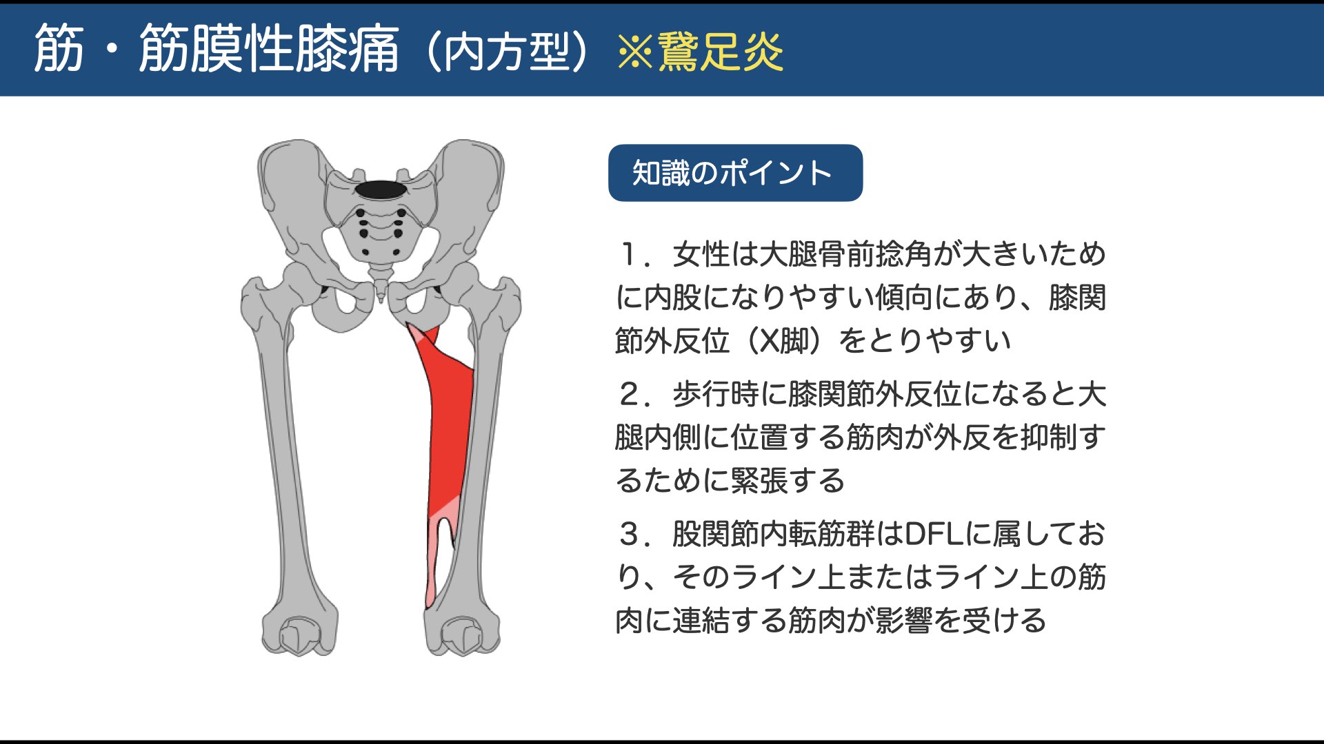 • ここでは内側痛が主体の筋・筋膜性膝痛を解説。女性に比較的多く、股関節内転筋群(薄筋・長短大内転筋・大内転筋)や内側広筋の過緊張を伴いがち。