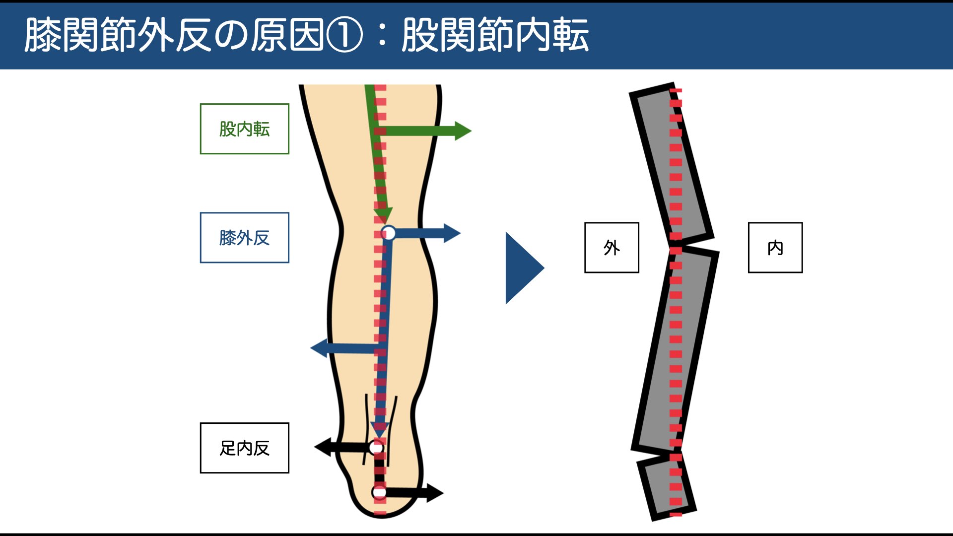 • 片脚立位・歩行中に膝が外反方向へぶれる(外反位荷重)→ 内反モーメントが発生(=倒れ込みを止める力)