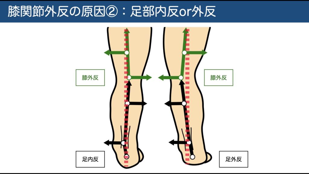 • **骨盤内方位・COM内方位・足部外反(回内)**は外反位荷重を助長。