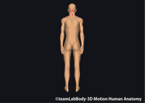 狙い所:外後頭隆起部の頭外被筋膜、第5–6頸椎レベルの脊柱起立筋。