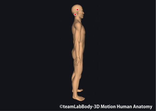 狙い所:C2–C3横突起(肩甲挙筋停止部周囲)、上耳介筋付近。