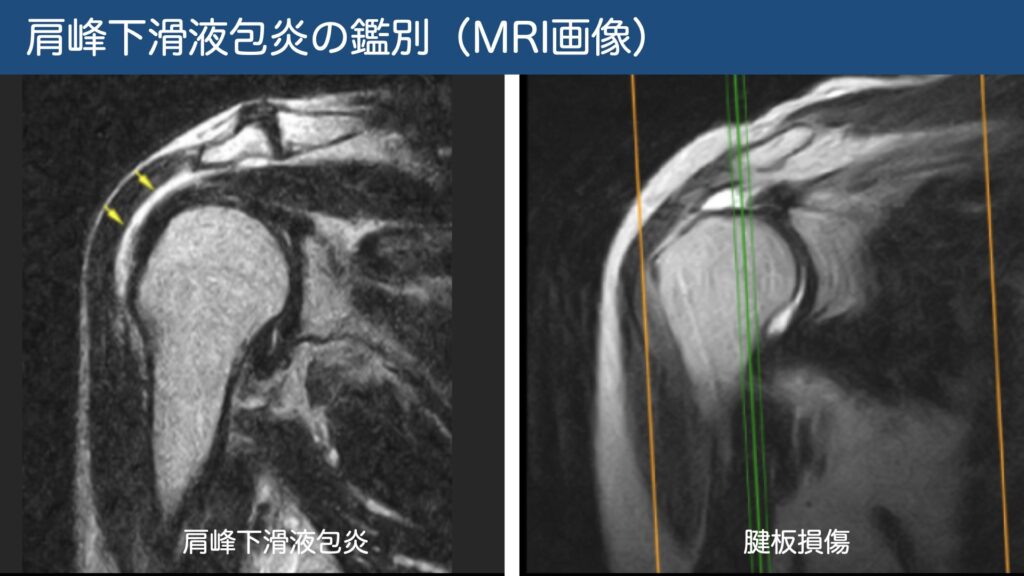 注意:臨床では腱板炎(棘上筋腱の変性・炎症)を併発することが多く、純粋な滑液包炎は少数です。痛みの広がりは**肩上面~外側(三角筋上)**に及びやすい。