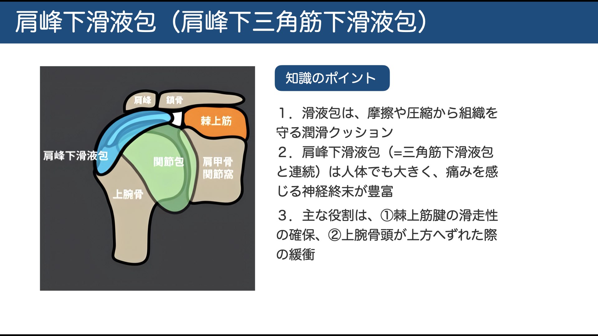 滑液包は、摩擦や圧縮から組織を守る“潤滑クッション”。その中でも肩峰下滑液包(=三角筋下滑液包と連続)は人体でも大きく、痛みを感じる神経終末が豊富です。