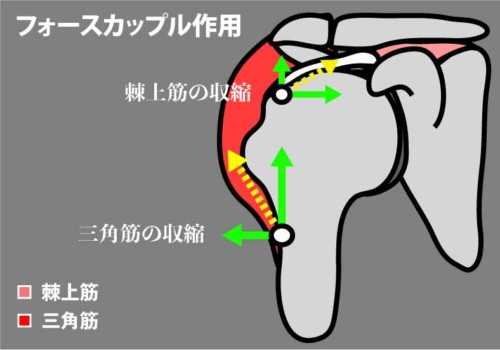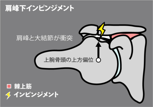 フォースカップル破綻:棘上筋(求心化)<三角筋(上方剪断)になると骨頭が上方偏位→肩峰下で棘上筋腱や滑液包が衝突。