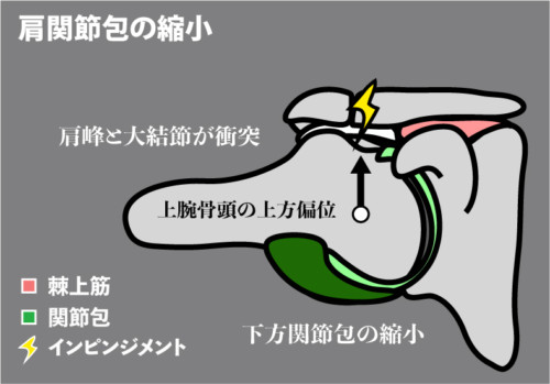下方関節包の縮小(肩関節周囲炎など):骨頭が潜り込めず上方へ押し出され衝突。