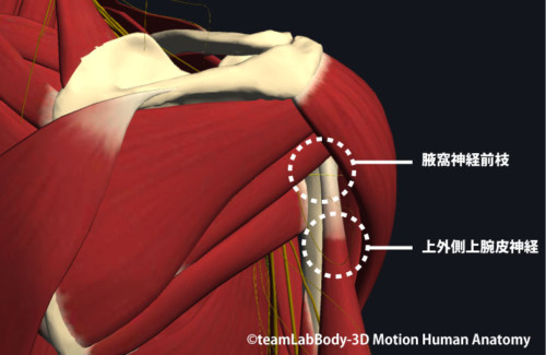 腋窩神経は四角間隙(小円筋・大円筋・上腕三頭筋長頭・上腕骨)を通過。圧迫で三角筋・小円筋の筋力低下+肩外側の知覚低下。