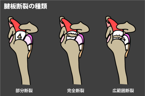 多くは棘上筋腱だが、広範囲断裂では棘下筋上部線維まで及び、外側~後方の痛み+挙上困難。