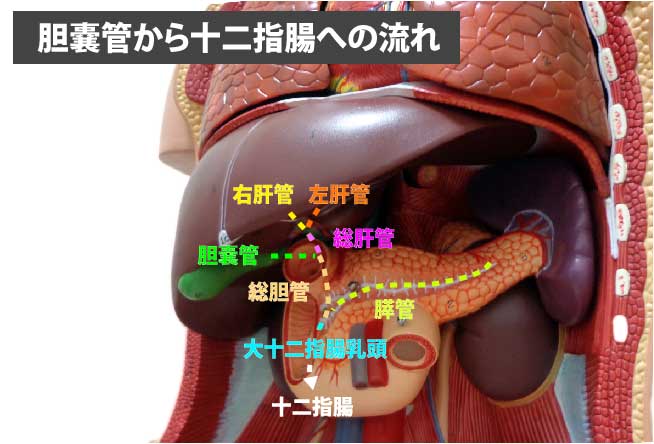 胆汁の流れ:胆嚢 → 胆嚢管 → 総肝管と合流して総胆管 →(膵管と合流)→ 大十二指腸乳頭から十二指腸へ。