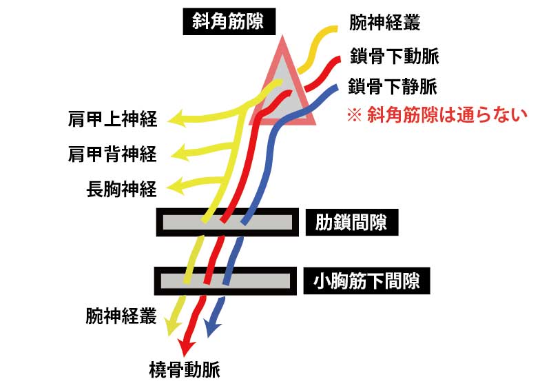 肋鎖間隙・小胸筋下間隙は下位腕神経叢と血管が通過 → 血流障害(冷感・腫脹)も出る