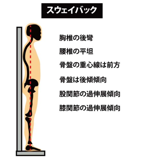 | 胸椎の後彎、腰椎の平坦、骨盤の重心線は前方、骨盤は後傾傾向、股関節の過伸展傾向、膝関節の過伸展傾向 |