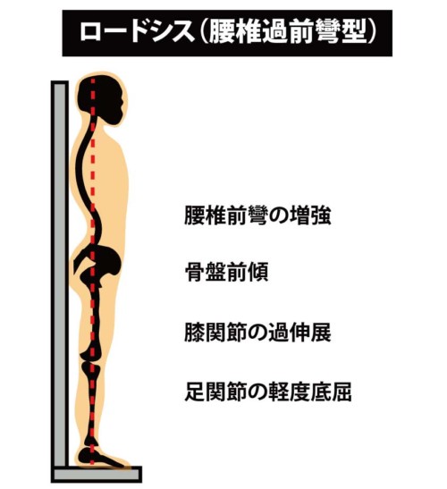 | 頭部前方姿勢、肩甲骨の外転、胸椎の後彎、腰椎前彎の増強、骨盤の前傾、股関節屈曲、膝関節過伸展 |