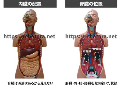 **位置は腹腔の“後ろ側”(後腹膜)**で、消化管のように腹腔内にはありません。