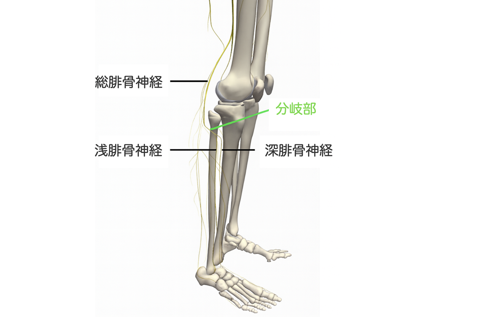 総腓骨神経は脛骨神経と並ぶ太い神経で、膝窩から腓骨頭を回り、浅腓骨神経と深腓骨神経に分枝します。