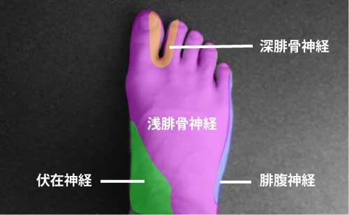 腓骨神経は下腿外側から足背にかけての感覚を支配しており、障害されるとしびれや感覚鈍麻が出現します。
