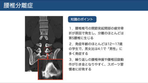 腰椎分離症は、腰椎椎弓の関節突起間部の疲労骨折が原因で発生し、分離のほとんどは第5腰椎に生じます。