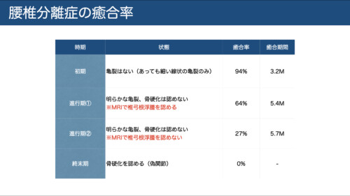 腰椎分離症は時期によって癒合率が大きく変化するため、患者がどの段階にあるか把握することが重要です。