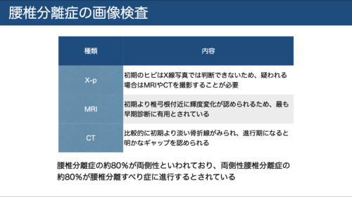 腰椎分離症の約80%が両側性といわれており、両側性腰椎分離症の約80%が腰椎分離すべり症に進行するとされています。