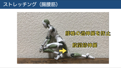 その後に自主トレーニングとしてストレッチングを指導しますが、その際は腰椎伸展が入らないように注意して行うことが大切です。