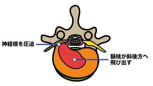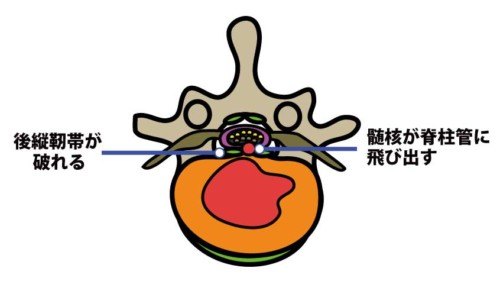 病態:後縦靱帯の「やや外側」を斜め後方へ突出。