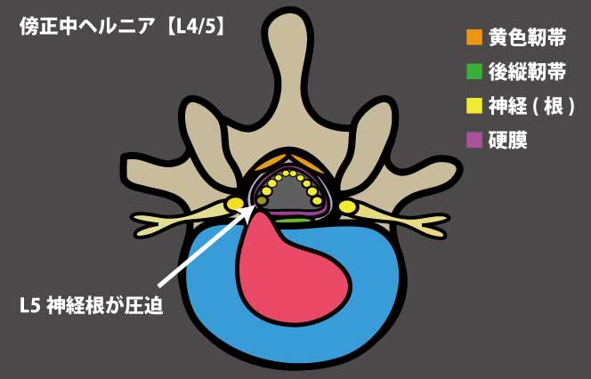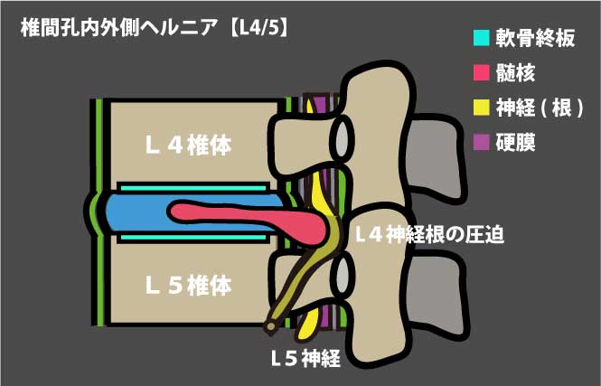 L4/5ヘルニア:傍正中ならL5、孔内外側/孔外ならL4が基本。