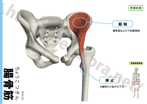| 停止 | 大腿骨小転子〜小転子遠位の骨皮質(大腰筋腱と合流) |