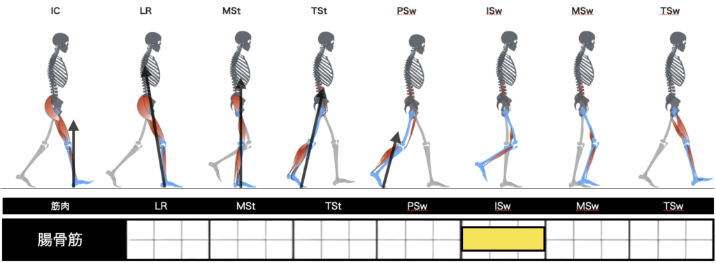**立脚終期(TSt)**の“引き戻し”後、下肢の振り出し方向づけに大腰筋と協調。