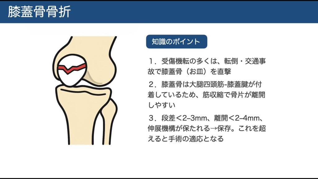 治療選択の一般目安:段差<2–3mm、離開<2–4mm、伸展機構が保たれる→保存。これを超える転位や粉砕、伸展不能(エクステンサーロス)→手術(代表:テンションバンドワイヤリング、スクリュー+ワイヤ等)。