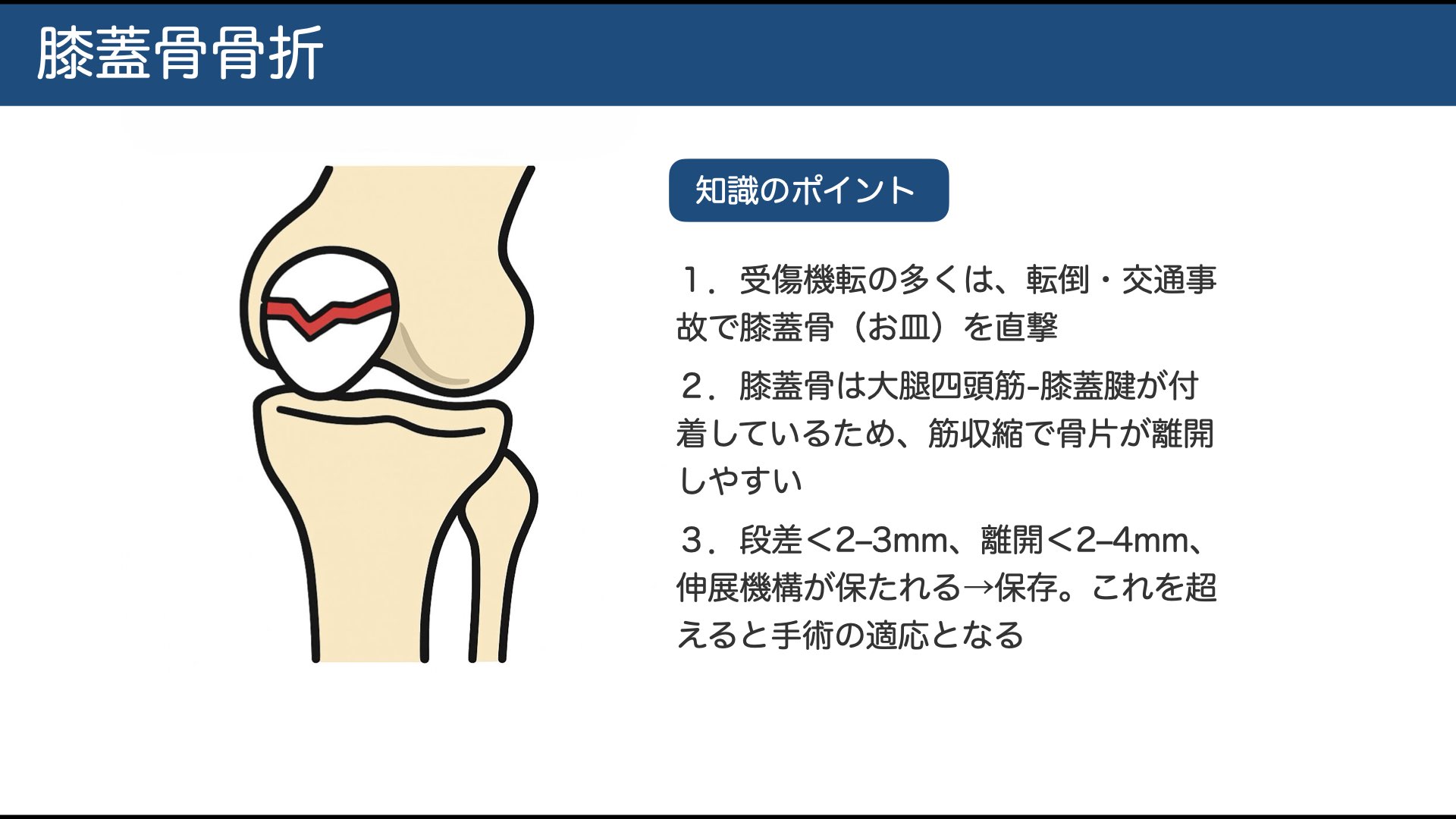 解剖学的特徴:大腿四頭筋‐膝蓋腱が付着→筋収縮で骨片が離開しやすい。