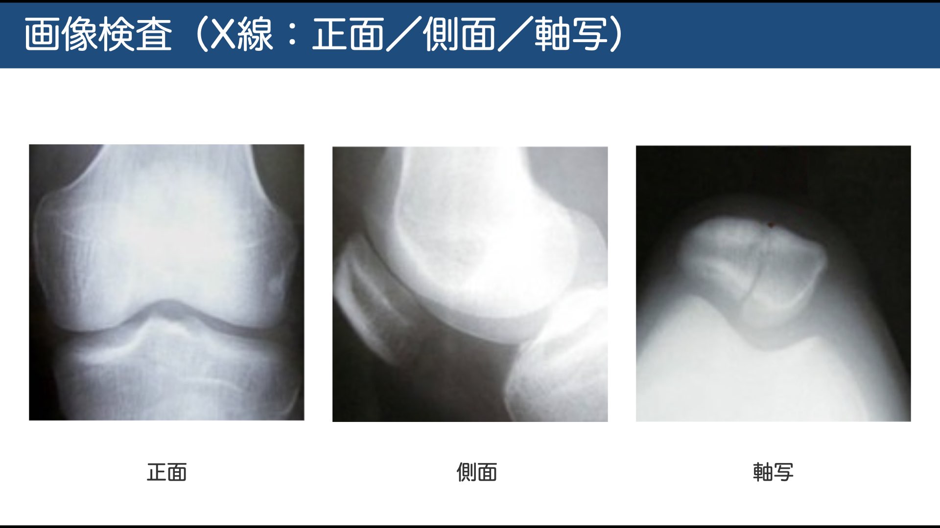 正面+側面に**軸写(スカイライン)**を追加すると骨折線・段差が見えやすい。