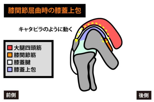 膝を深く曲げると、膝蓋上包の後方膜が前方へ「キャタピラ状」に移動し、前方が伸びて屈曲を許容。