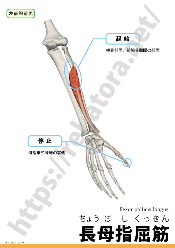 長母指屈筋は前腕前面の深層に位置し、深指屈筋(FDP)と並走して橈側を下行、手根管を通って母指末節骨底に停止します。