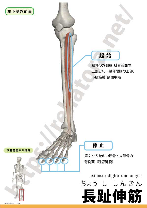 下腿前外側区画にある第2–5趾伸展の主力筋。近位は前脛骨筋の外側、遠位は長腓骨筋の前方に接し、遠位部の一部は第三腓骨筋として分岐します。