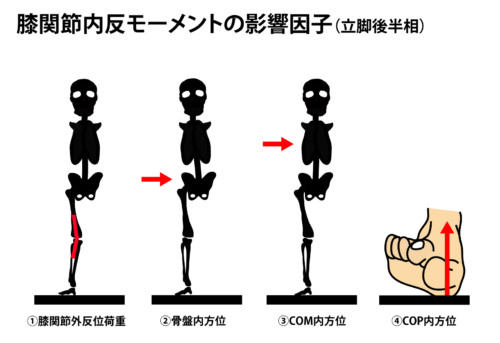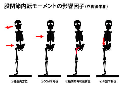 股関節内転モーメント↑:骨盤内方位、COM内方偏倚、対側骨盤下制、外転位荷重の崩れ