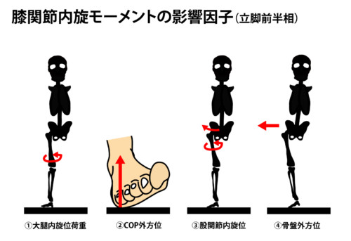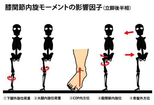 膝内旋モーメント↑:大腿内旋×下腿外旋(同方向回旋ならモーメントは小)