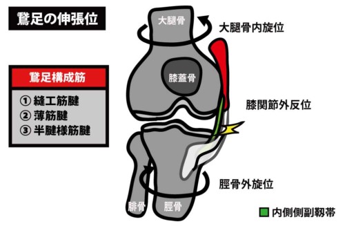 下腿外旋症候群:下腿外旋位固定で鵞足張力↑。