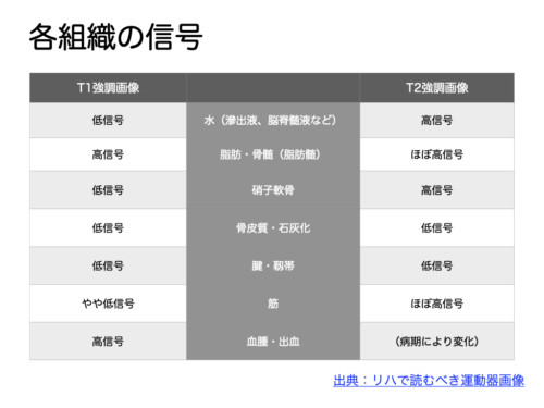 軟部組織に強い(筋・腱・靱帯・軟骨・髄内・神経・関節液など)。骨皮質は信号が出にくい。