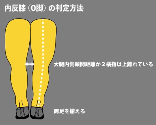 評価:両膝の隙間=**大腿骨内側顆間距離(インターコンドラーギャップ)**を測定。